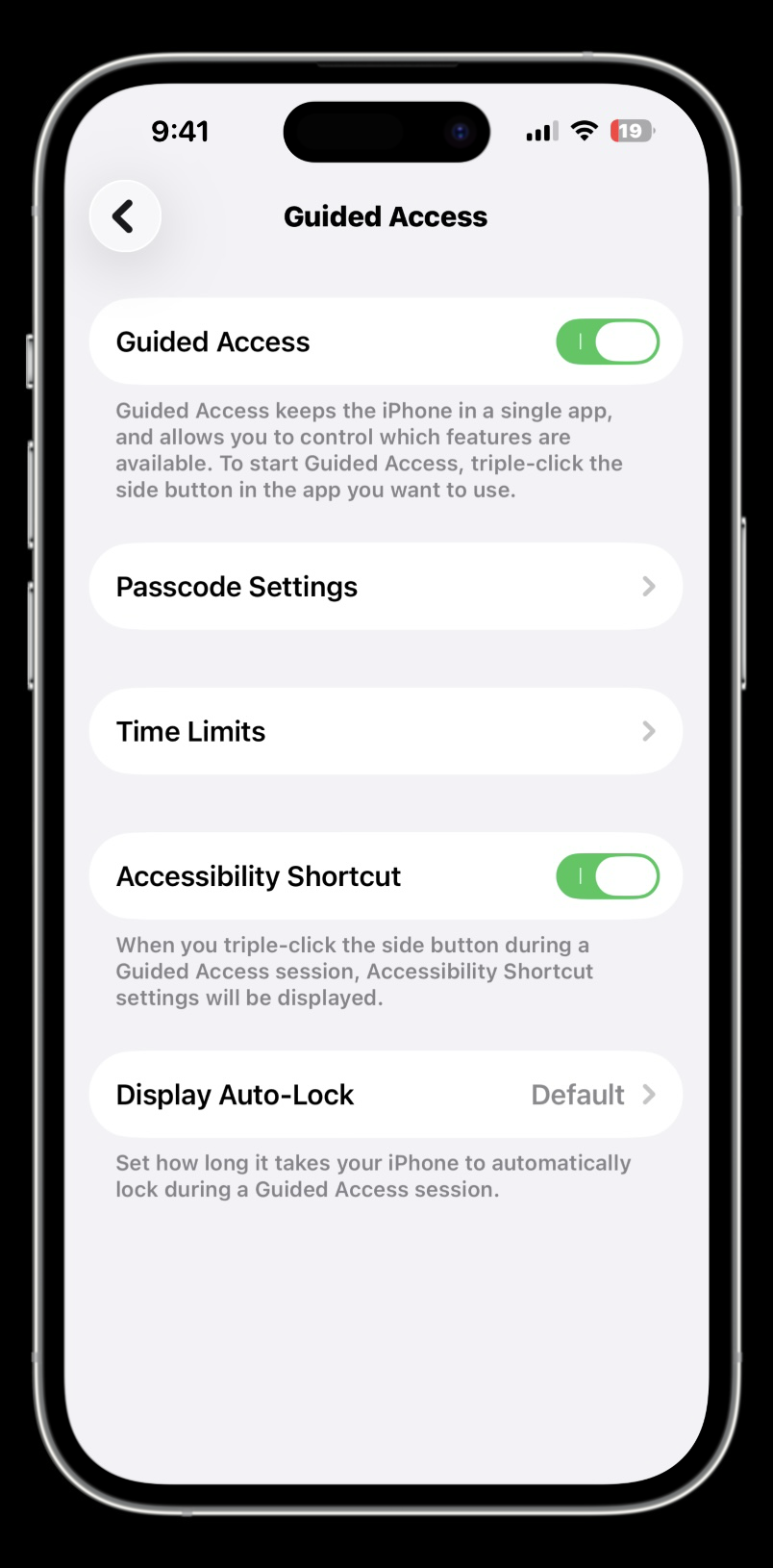‣ Display Auto-Lock: Set how long it takes for your device to go to sleep if left inactive in a Guided Access session. This can be a different amount of time from the normal Auto-Lock Timeout set in Display & Brightness settings.